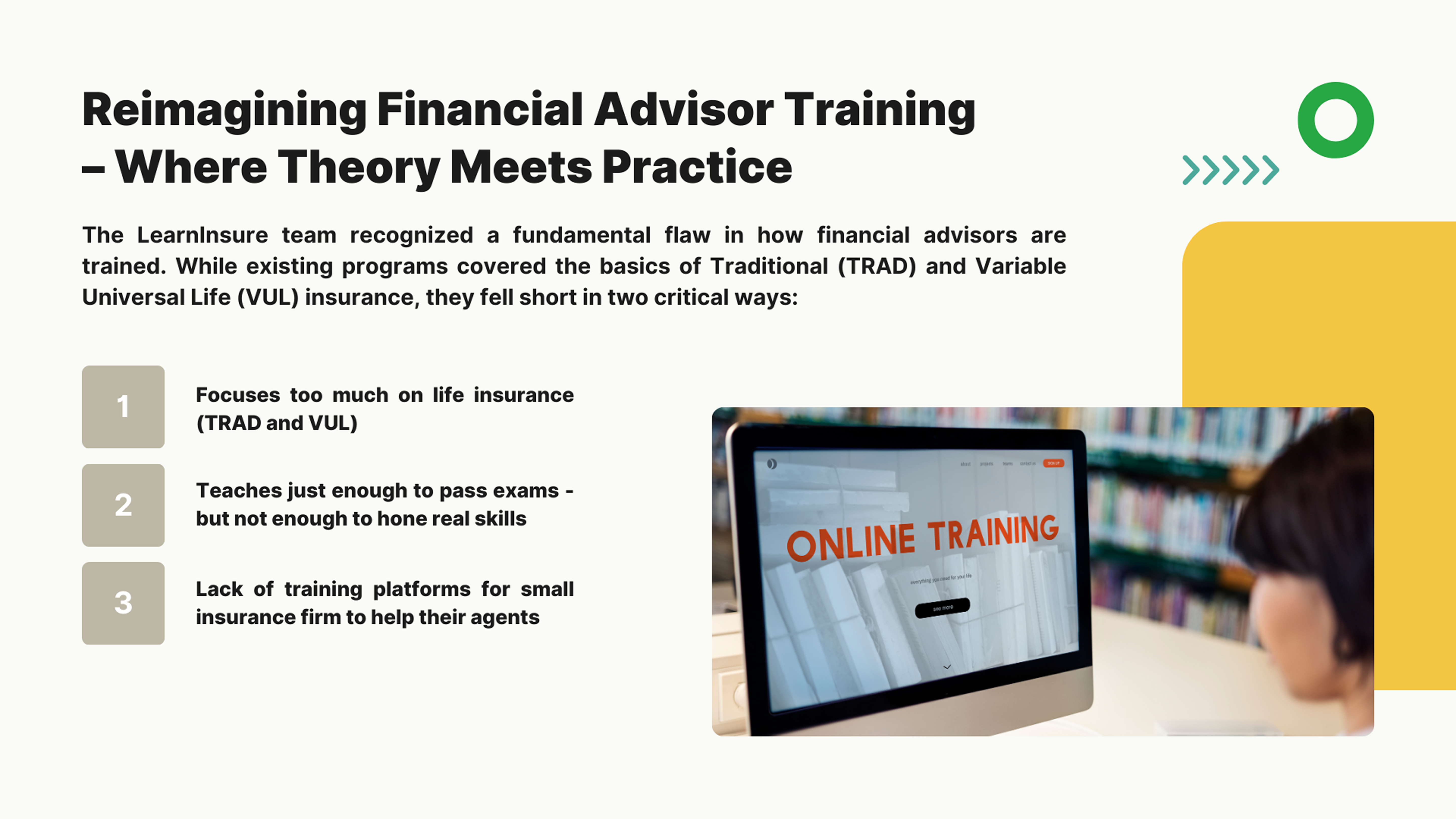 We envision a new generation of financial advisors who are not only licensed but also truly prepared to serve with competence, integrity, and care. We're here to replace boring lectures with interactive, relatable training that sticks.